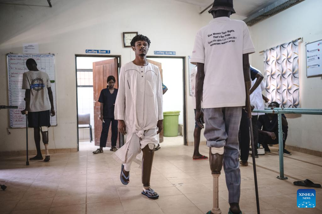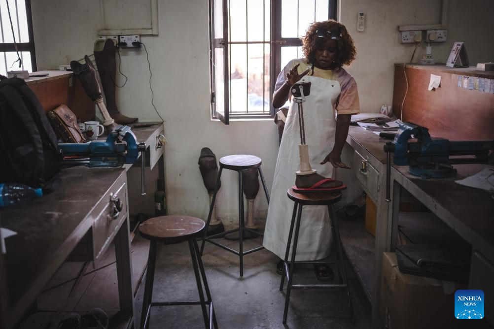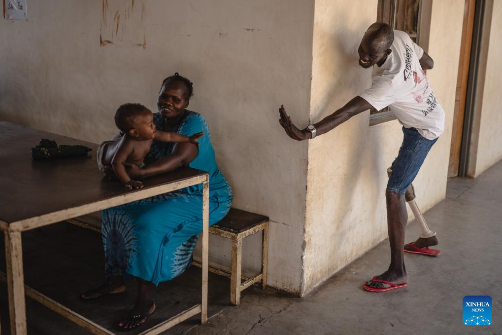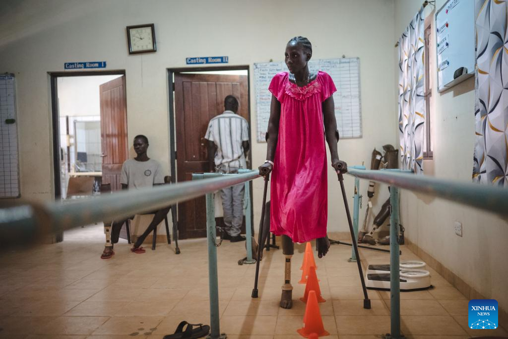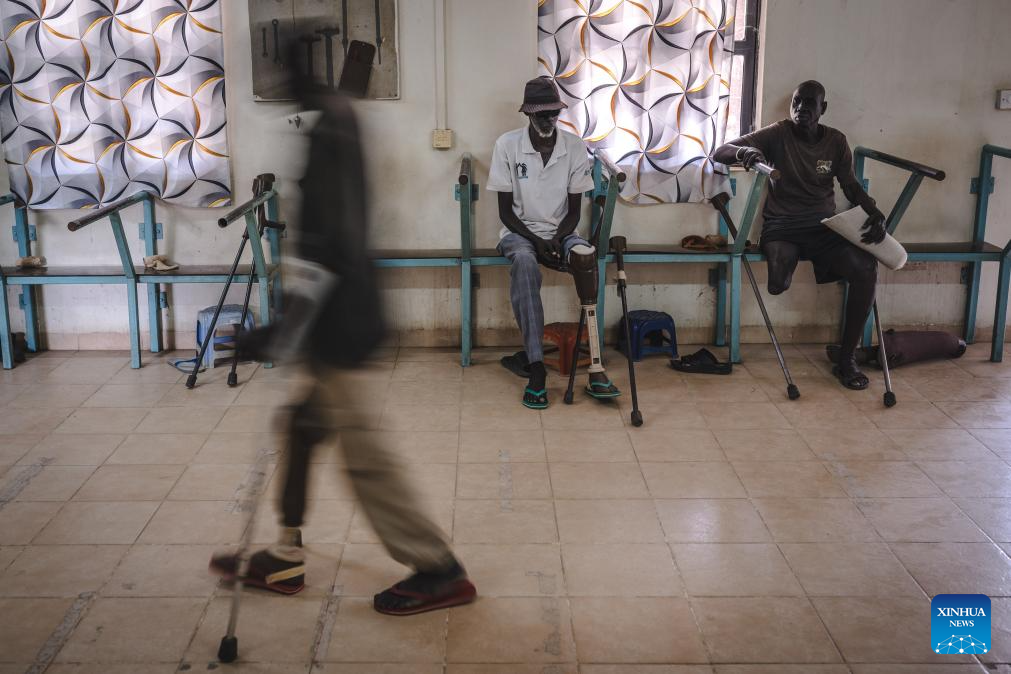 A staff member from the International Committee of the Red Cross (ICRC) South Sudan delegation checks the prosthesis at a physical rehabilitation center in Juba, the capital of South Sudan, on Feb. 28, 2025. The physical rehabilitation center currently accommodates over 30 individuals, aiming to assist refugees disabled by conflicts to regain their functions. (Xinhua/Wang Guansen)