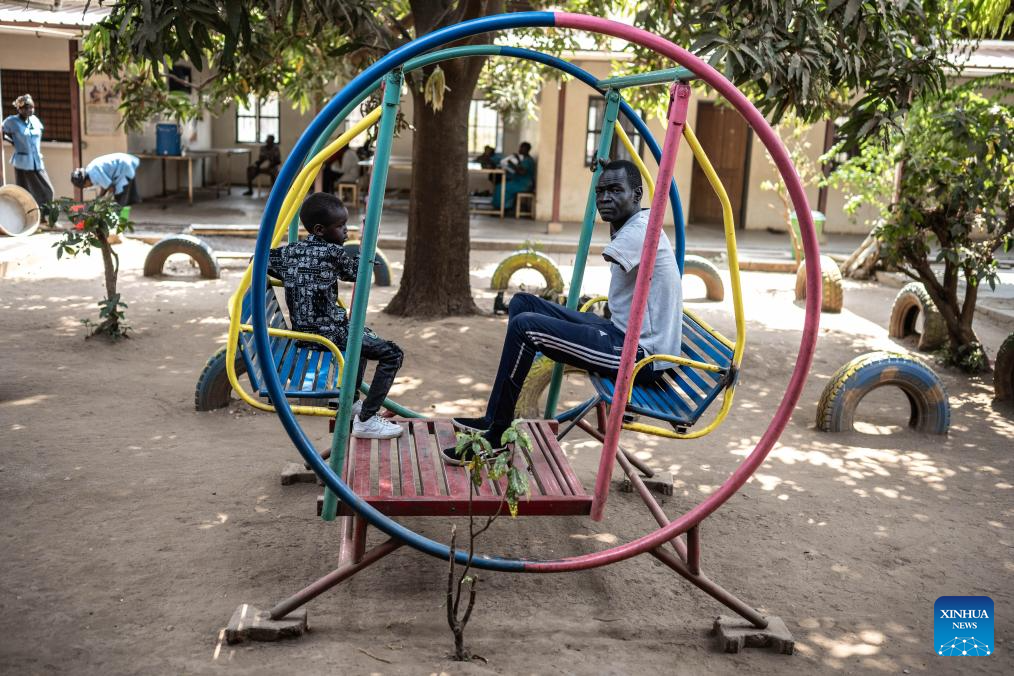 A disabled refugee plays with a child at a physical rehabilitation center in Juba, the capital of South Sudan, on Feb. 28, 2025. The physical rehabilitation center currently accommodates over 30 individuals, aiming to assist refugees disabled by conflicts to regain their functions. (Xinhua/Wang Guansen)