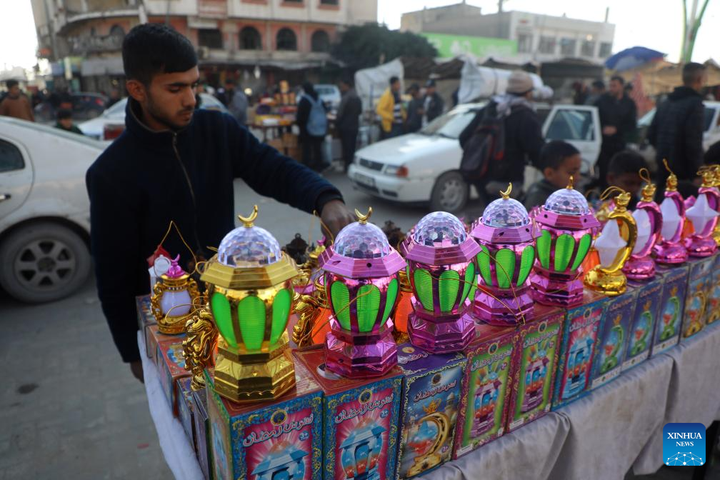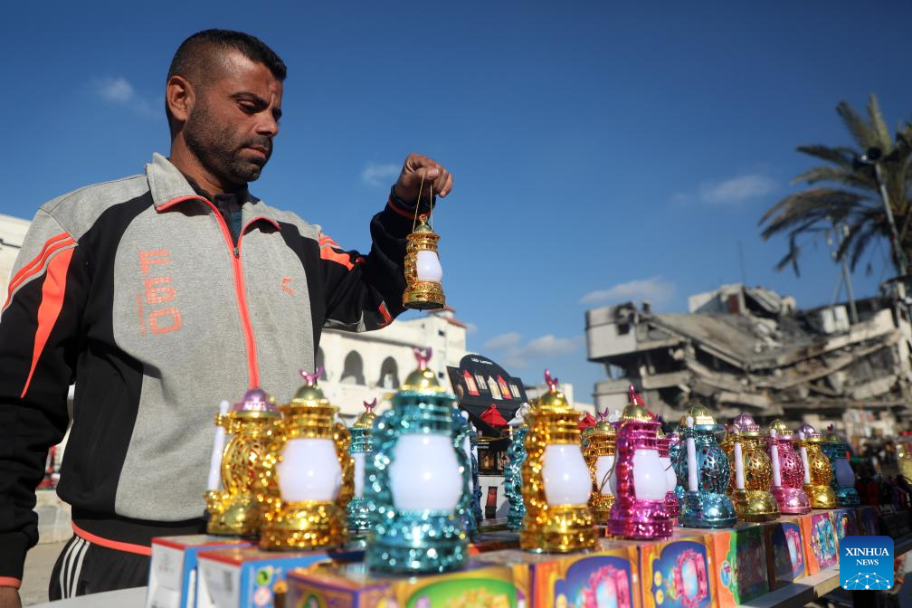 A man sells products at a market ahead of Ramadan in Gaza City, on Feb. 28, 2025. (Photo by Rizek Abdeljawad/Xinhua)