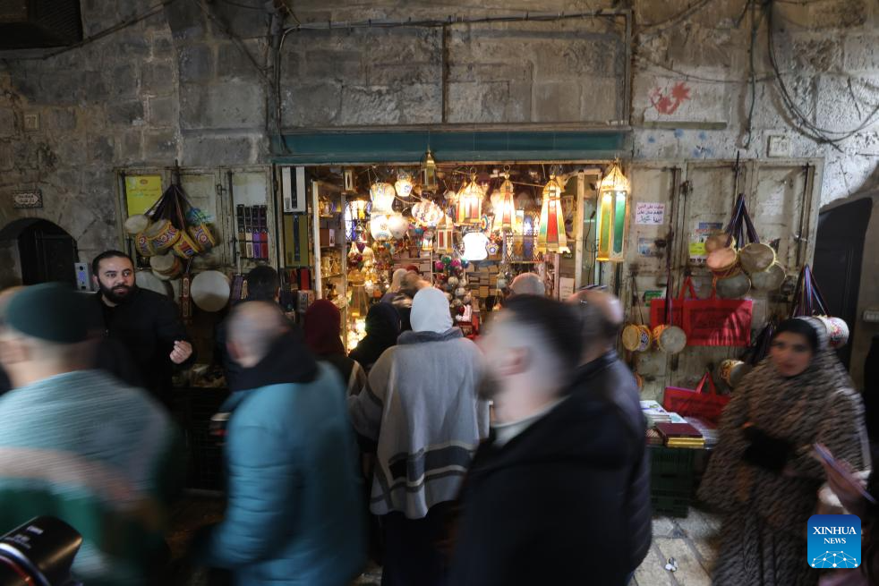 People walk past a store ahead of Ramadan in Jerusalem's Old City, on Feb. 28, 2025. (Photo by Jamal Awad/Xinhua)