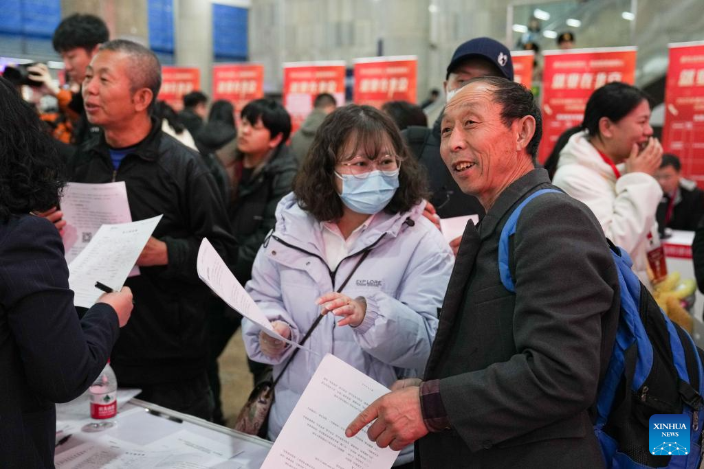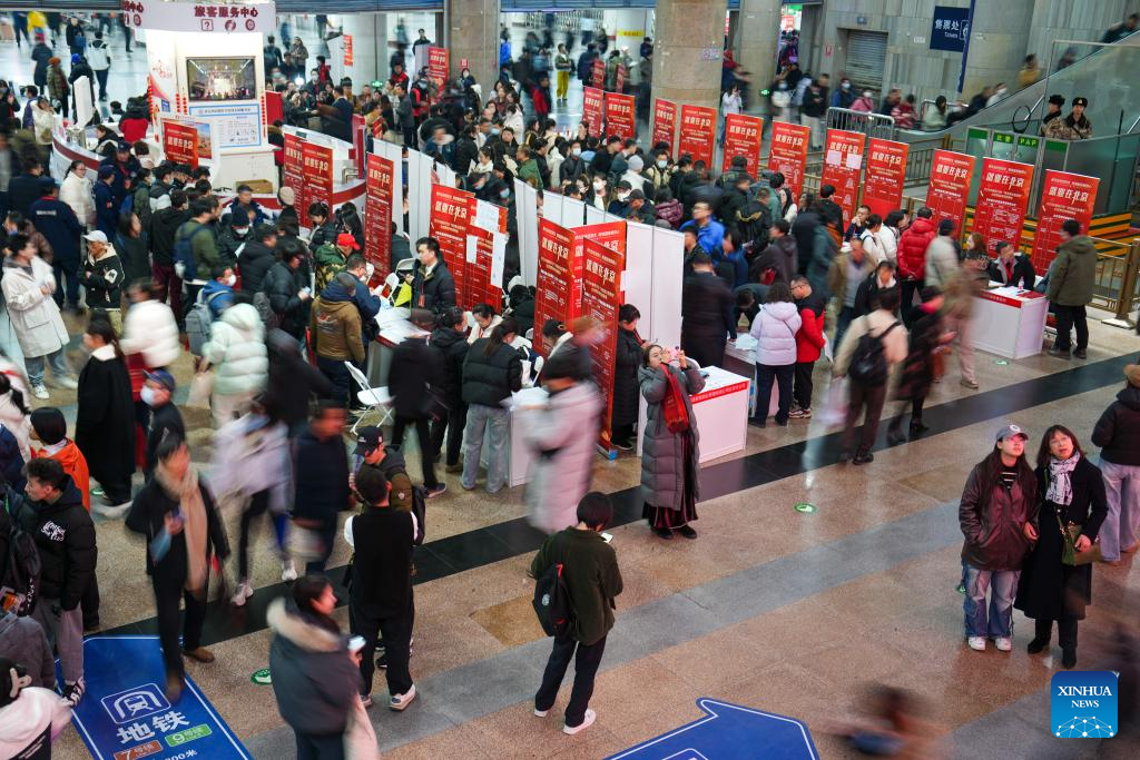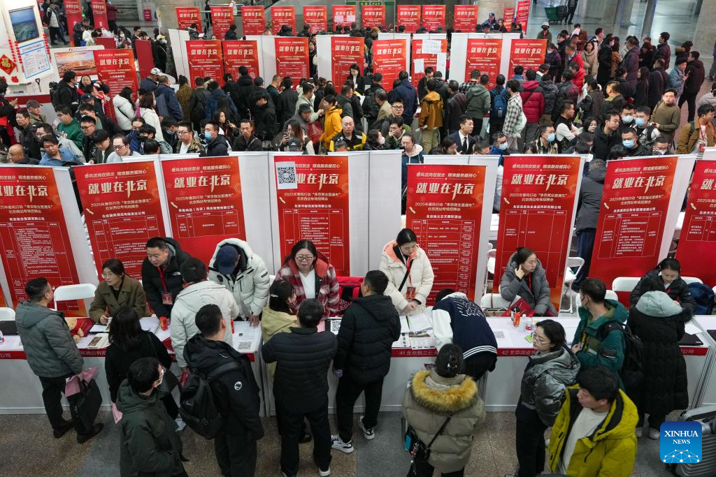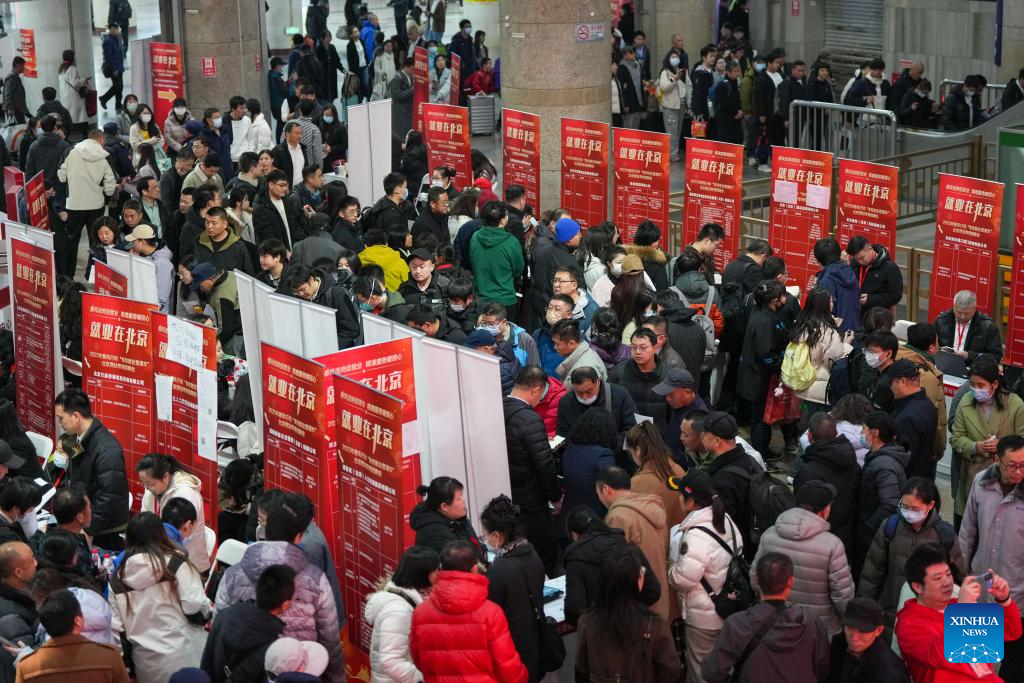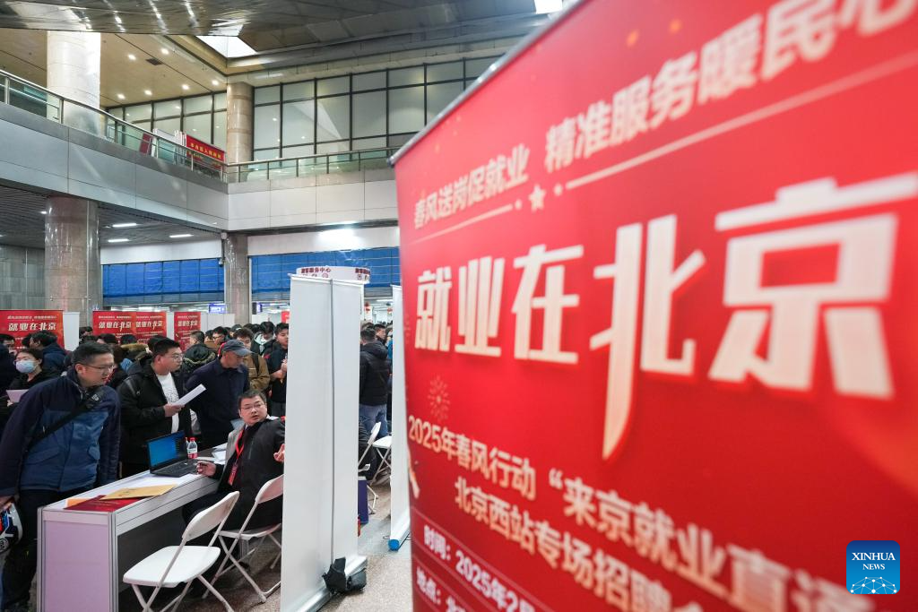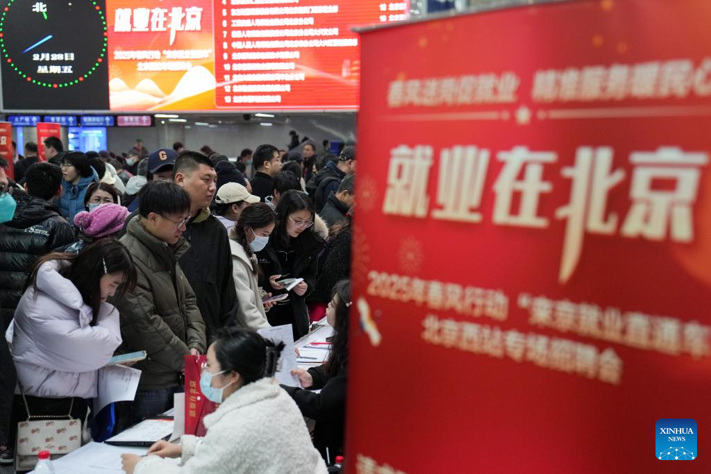 Job seekers attend a job fair held at the Beijing West Railway Station in Beijing, capital of China, Feb. 28, 2025. The job fair kicked off on Friday at the railway station to facilitate job hunting efforts of migrant workers who have just arrived in the city. Nearly 100 employers offered more than 3,000 openings at the fair. (Xinhua/Ju Huanzong)