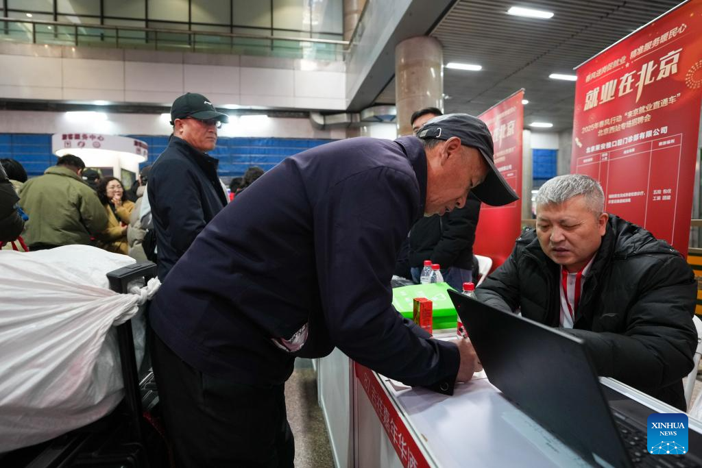 A job seeker (front L) who has just disembarked the train registers his job request during a job fair held at the Beijing West Railway Station in Beijing, capital of China, Feb. 28, 2025. The job fair kicked off on Friday at the railway station to facilitate job hunting efforts of migrant workers who have just arrived in the city. Nearly 100 employers offered more than 3,000 openings at the fair. (Xinhua/Ju Huanzong)