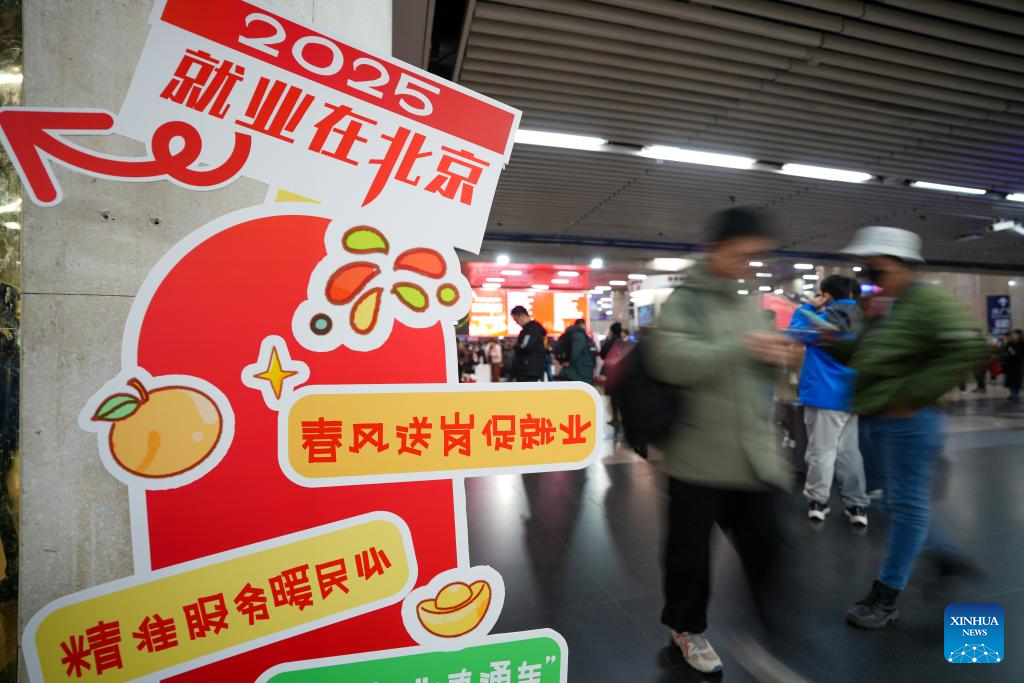 This photo taken on Feb. 28, 2025 shows a job fair held at the Beijing West Railway Station in Beijing, capital of China. The job fair kicked off on Friday at the railway station to facilitate job hunting efforts of migrant workers who have just arrived in the city. Nearly 100 employers offered more than 3,000 openings at the fair. (Xinhua/Ju Huanzong)