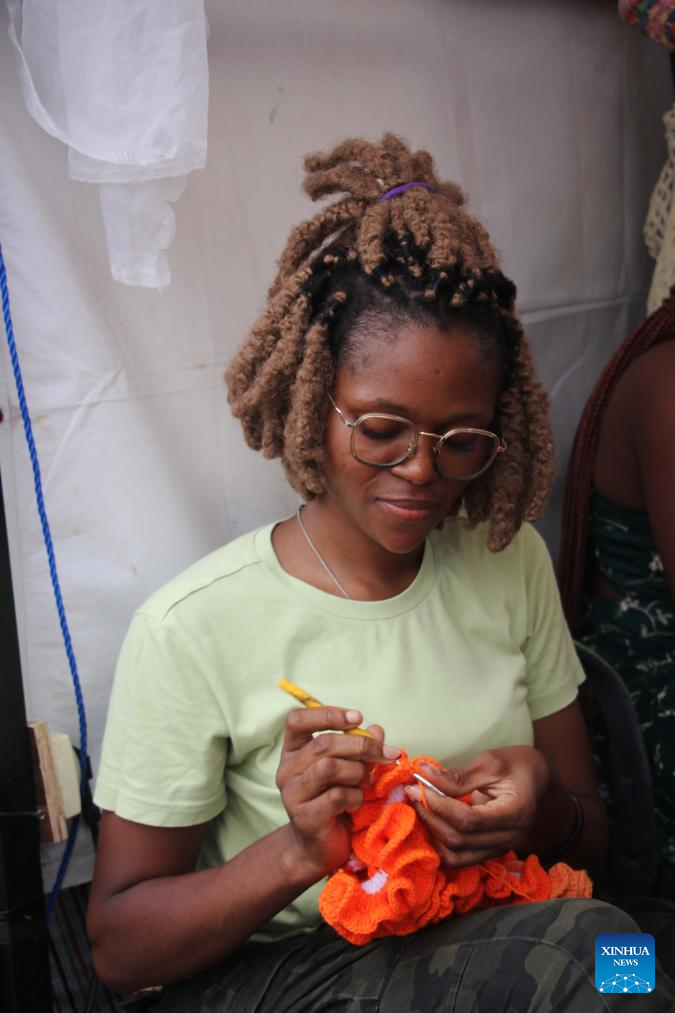 A woman is seen knitting during the Benin International Arts Festival in Cotonou, Benin, Feb. 28, 2025. (Photo by Seraphin Zounyekpe/Xinhua)