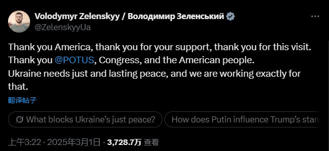 Zelensky afterward wrote on social media platform X: "Thank you America, thank you for your support, thank you for this visit. Thank you @POTUS (President Trump), Congress, and the American people. Ukraine needs just and lasting peace, and we are working exactly for that."