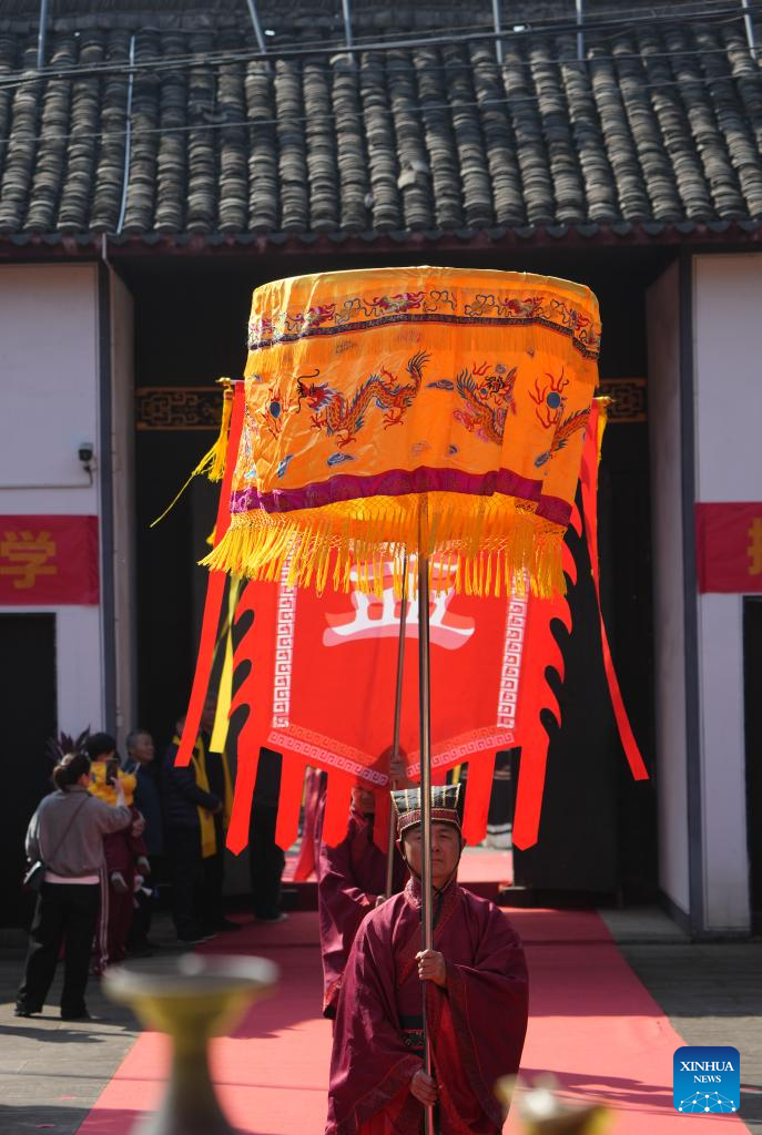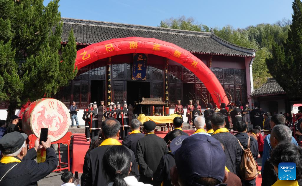People attend a rite at the Mencius Temple in Yingdianjie Town of Zhuji, east China's Zhejiang Province, March 1, 2025. The rite, attended by descendants of Mencius and people from all walks of life, was held here on Saturday to celebrate Mencius' birthday. (Xinhua/Weng Xinyang)