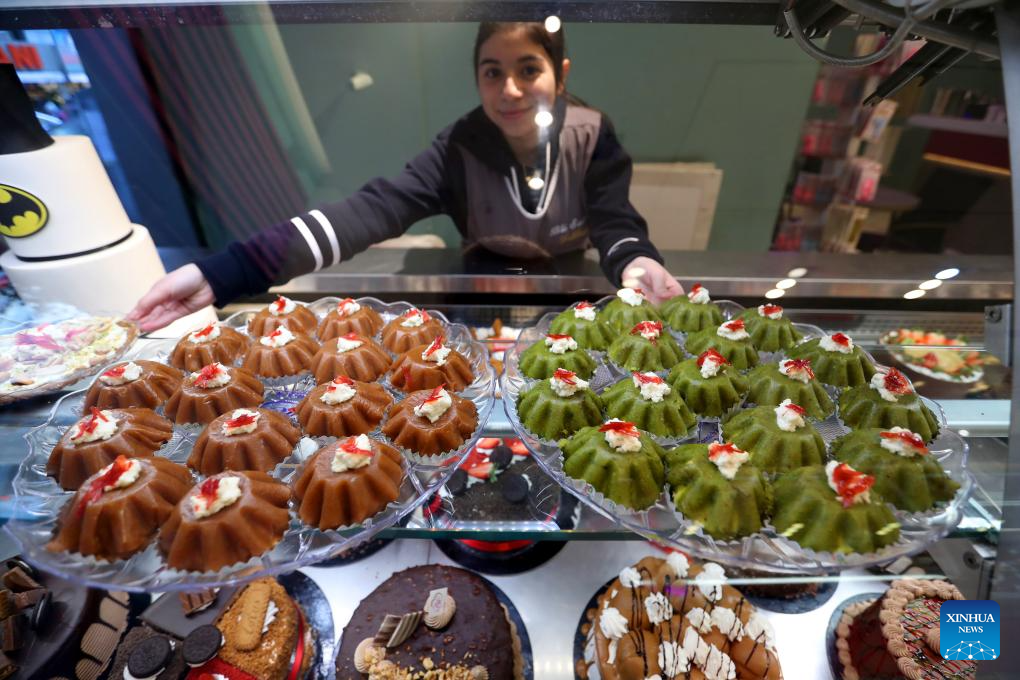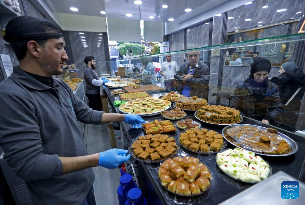 A staff member arranges desserts on the first day of Ramadan in Beirut, Lebanon, March 1, 2025. (Xinhua/Bilal Jawich)