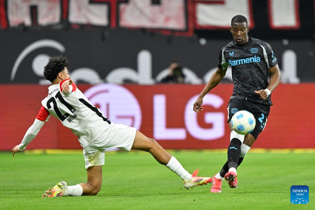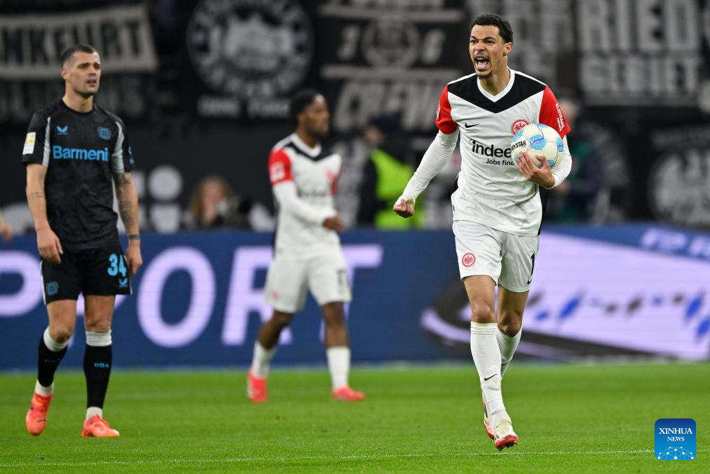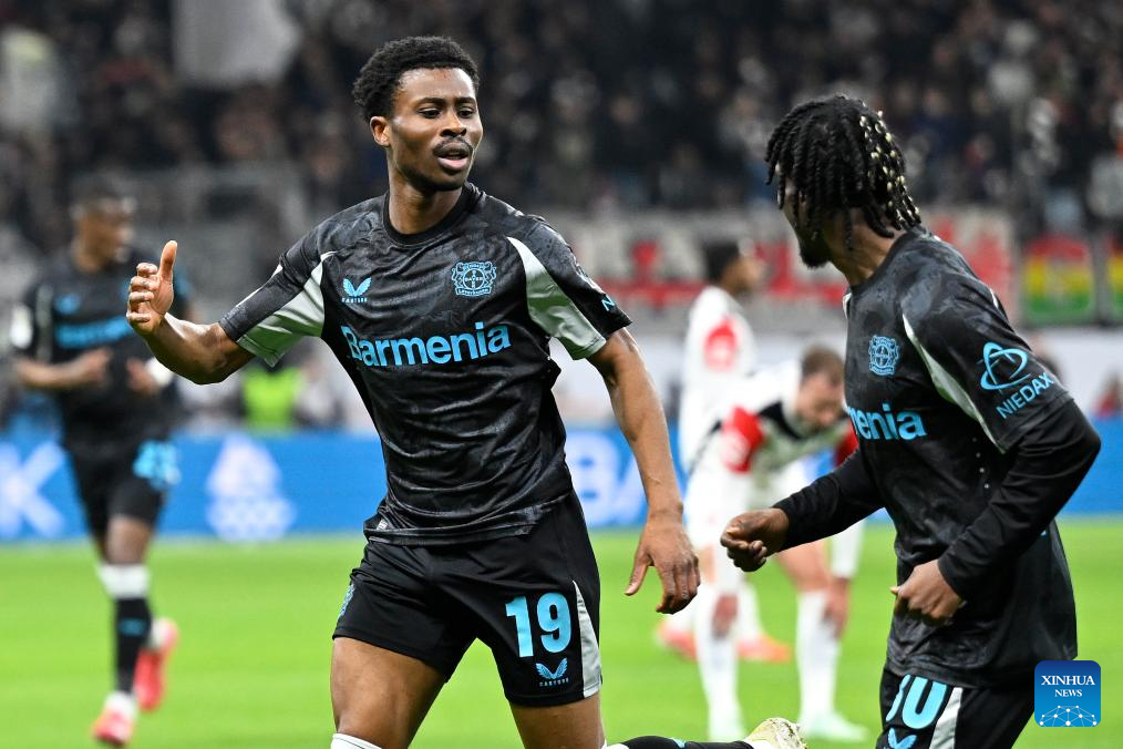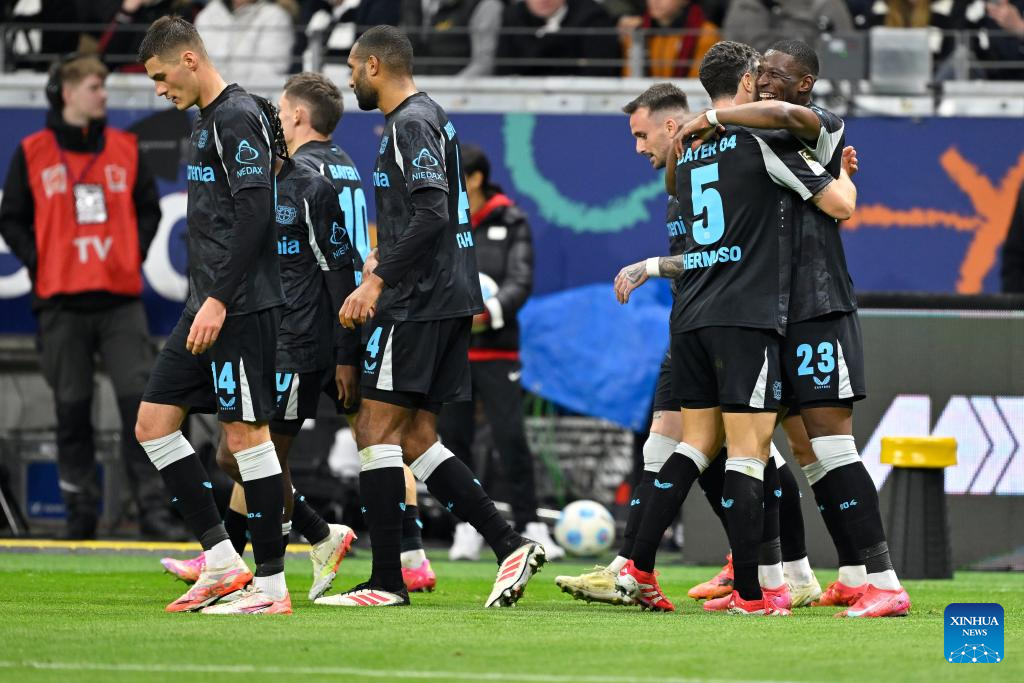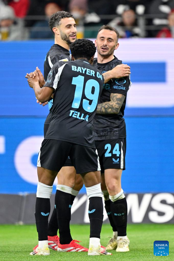 Nathan Tella (L) of Bayer 04 Leverkusen celebrates scoring during the German first division of Bundesliga football match between Eintracht Frankfurt and Bayer 04 Leverkusen in Frankfurt, Germany, March 1, 2025. (Photo by Ulrich Hufnagel/Xinhua)
