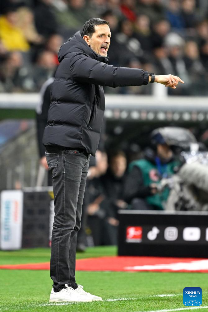Dino Toppmoeller, head coach of Eintracht Frankfurt, instructs during the German first division of Bundesliga football match between Eintracht Frankfurt and Bayer 04 Leverkusen in Frankfurt, Germany, March 1, 2025. (Photo by Ulrich Hufnagel/Xinhua)