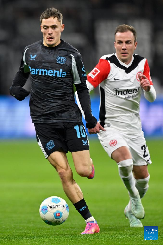 Mario Goetze (R) of Eintracht Frankfurt vies with Florian Wirtz of Bayer 04 Leverkusen during the German first division of Bundesliga football match between Eintracht Frankfurt and Bayer 04 Leverkusen in Frankfurt, Germany, March 1, 2025. (Photo by Ulrich Hufnagel/Xinhua)