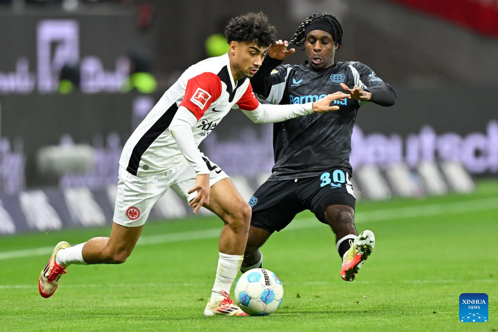 Nathaniel Brown (L) of Eintracht Frankfurt vies with Jeremie Frimpong of Bayer 04 Leverkusen during the German first division of Bundesliga football match between Eintracht Frankfurt and Bayer 04 Leverkusen in Frankfurt, Germany, March 1, 2025. (Photo by Ulrich Hufnagel/Xinhua)