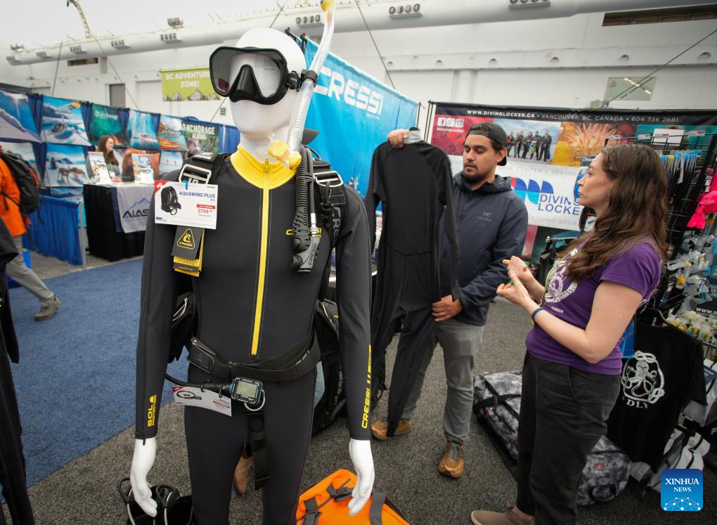 A man views diving outfits during the 2025 Outdoor Adventure and Travel Show in Vancouver, British Columbia, Canada, March 2, 2025.