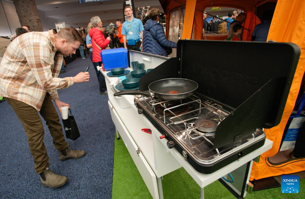 A man views a camping kitchen during the 2025 Outdoor Adventure and Travel Show in Vancouver, British Columbia, Canada, March 2, 2025.