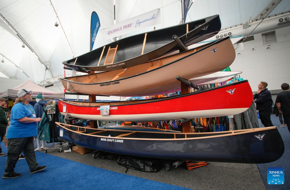 A man views canoes during the 2025 Outdoor Adventure and Travel Show in Vancouver, British Columbia, Canada, March 2, 2025.