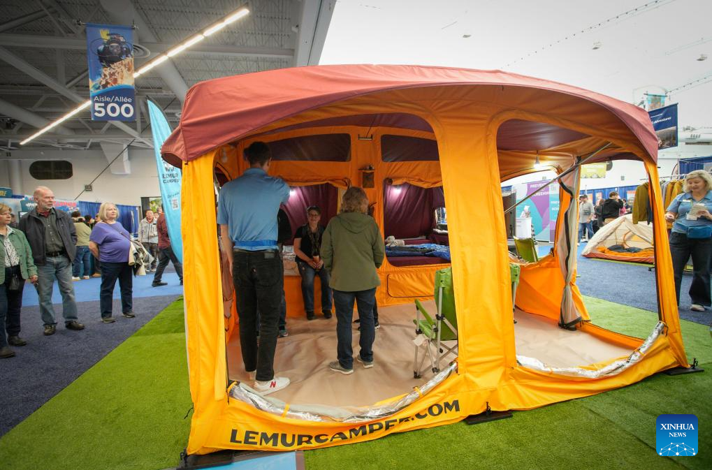 People learn about a camping tent during the 2025 Outdoor Adventure and Travel Show in Vancouver, British Columbia, Canada, March 2, 2025.