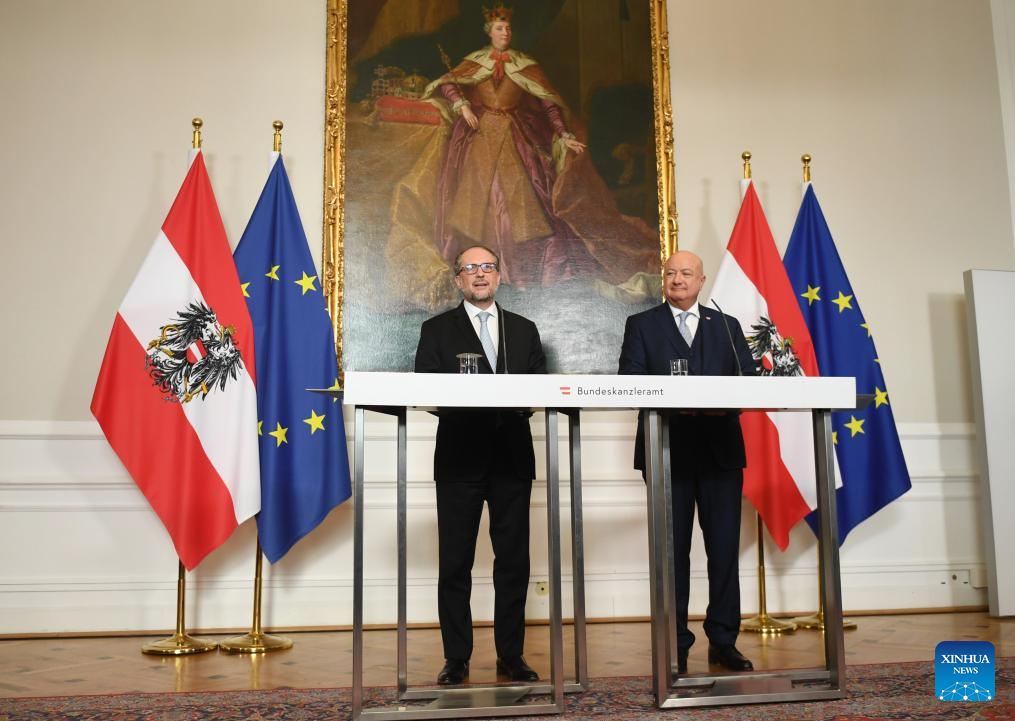 Austrian interim Chancellor Alexander Schallenberg (L) and Leader of the People's Party Christian Stocker attend a press conference on the handover of office after the swearing-in ceremony in Vienna, Austria, March 3, 2025. Austria's new government was sworn in on Monday, ending five months of political deadlock over forming a coalition. (Xinhua/He Canling)