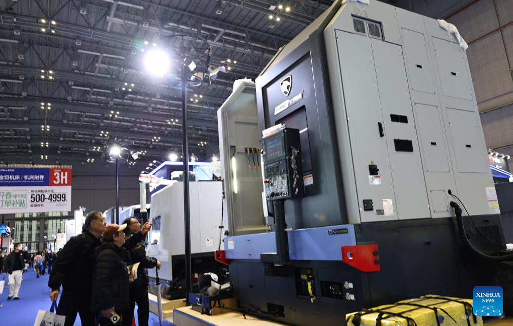 Visitors look at a turning center exhibit during the Shanghai International Machine Tool Exhibition in Shanghai, east China, March 3, 2025. The 2025 Shanghai International Machine Tool Exhibition kicked off on Monday at the National Exhibition and Convention Center in Shanghai.