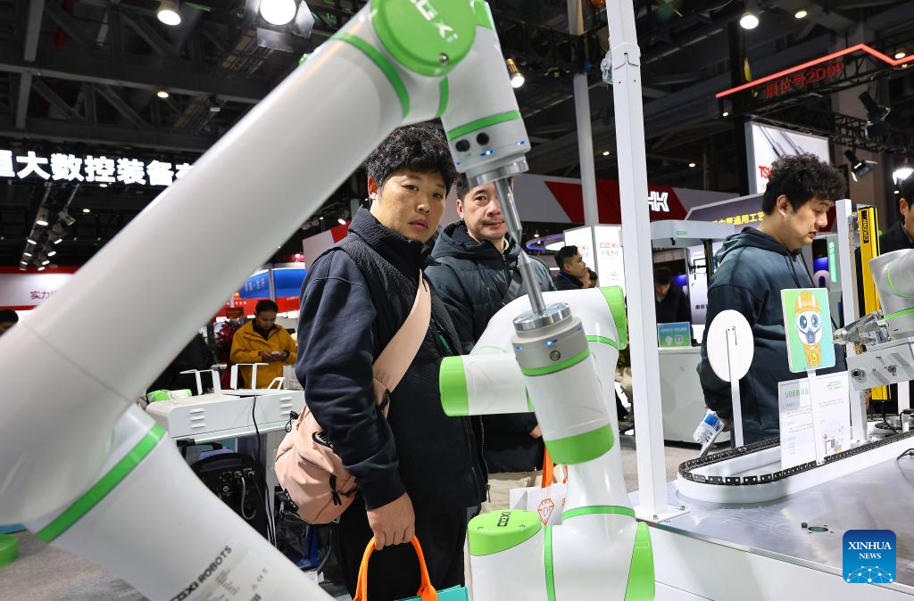 Visitors watch a robot demonstration during the Shanghai International Machine Tool Exhibition in Shanghai, east China, March 3, 2025. The 2025 Shanghai International Machine Tool Exhibition kicked off on Monday at the National Exhibition and Convention Center in Shanghai.