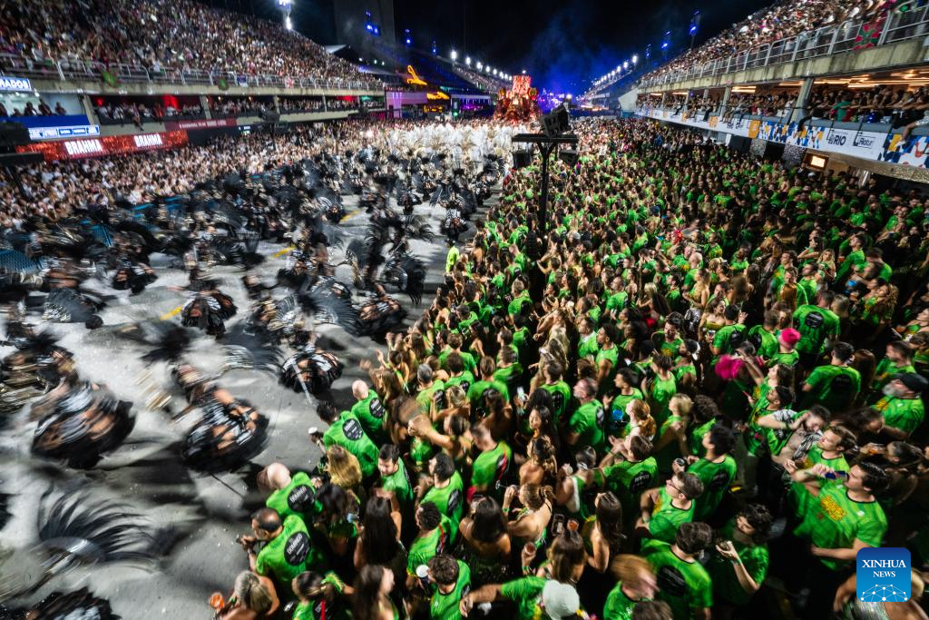 People watch the parade during the Rio Carnival 2025 on the Marques De Sapucai Avenue in Rio de Janeiro, Brazil, March 3, 2025. (Xinhua/Wang Tiancong)