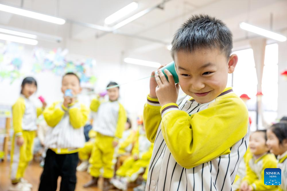 Children play with a sound-conducting toy made with paper cups at a kindergarten in Changxing County, Huzhou City, east China's Zhejiang Province, March 3, 2025. March 3 marks China's national Ear Care Day. Various activities were held to promote public awareness of hearing protection. (Photo by Tan Yunfeng/Xinhua)