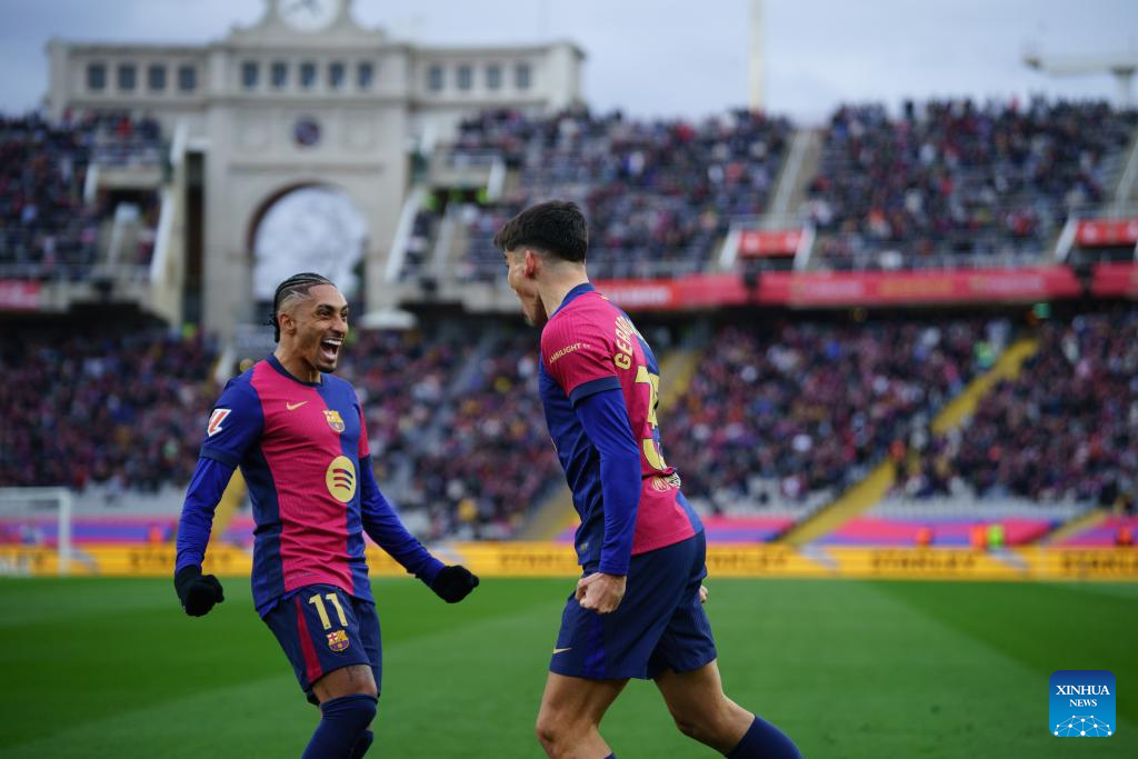 Gerard Martin (R) and Raphinha of FC Barcelona celebrate a goal during the La Liga football match between FC Barcelona and Real Sociedad, in Lluis Companys Olympic Stadium, Barcelona, on March 2, 2025. (Photo by Joan Gosa/Xinhua)