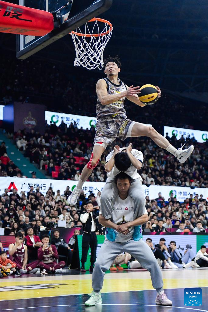 Wildcard entrant Chen Dengxing (up) competes during the Slam Dunk Contest at the 2025 CBA All-Star Weekend in Changchun, northeast China's Jilin Province, March 2, 2025. (Xinhua/Xu Chang)