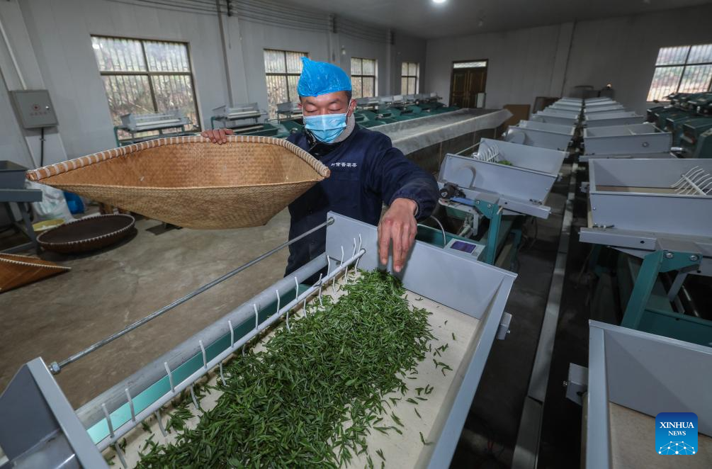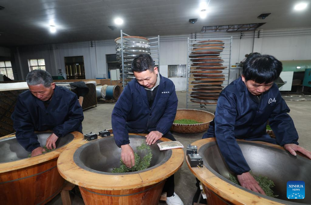 Workers process tea leaves at the workshop of a tea garden in Wangzhai Town of Wuyi County, Jinhua City, east China's Zhejiang Province, March 5, 2025. As spring unfolds, tea gardens across Wuyi County have entered the harvest season.