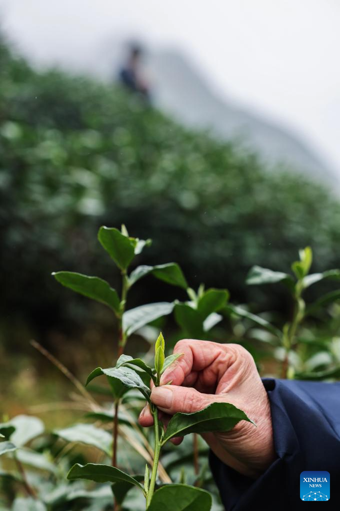 A farmer displays freshly-picked tea leaves at a tea garden in Wangzhai Town of Wuyi County, Jinhua City, east China's Zhejiang Province, March 5, 2025. As spring unfolds, tea gardens across Wuyi County have entered the harvest season.