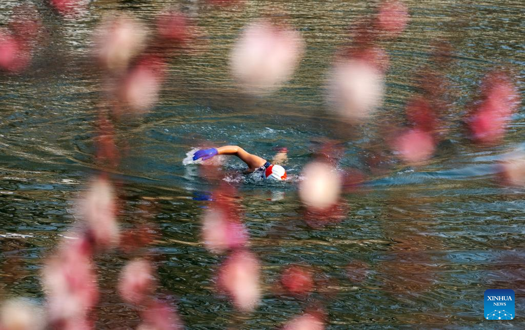 A swimmer is pictured in a moat near Zuo'anmen Gate in Beijing, capital of China, March 5, 2025. Wednesday marks the day of "Jingzhe" or "Awakening of Insects," the third of 24 solar terms on China's Lunar Calendar. It is believed to be the time for spring farming. (Xinhua/Fei Maohua)