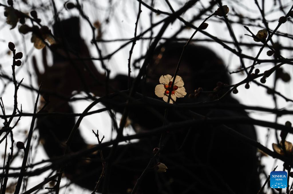 A person takes photos of blooming plum flowers in Beijng, capital of China, March 5, 2025. Wednesday marks the day of "Jingzhe" or "Awakening of Insects," the third of 24 solar terms on China's Lunar Calendar. It is believed to be the time for spring farming. (Xinhua/Fei Maohua)