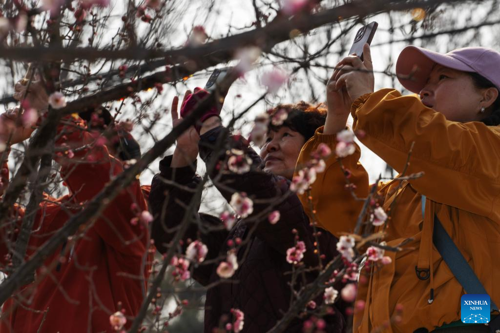 People take photos of blooming plum flowers in Beijng, capital of China, March 5, 2025. Wednesday marks the day of "Jingzhe" or "Awakening of Insects," the third of 24 solar terms on China's Lunar Calendar. It is believed to be the time for spring farming. (Xinhua/Fei Maohua)