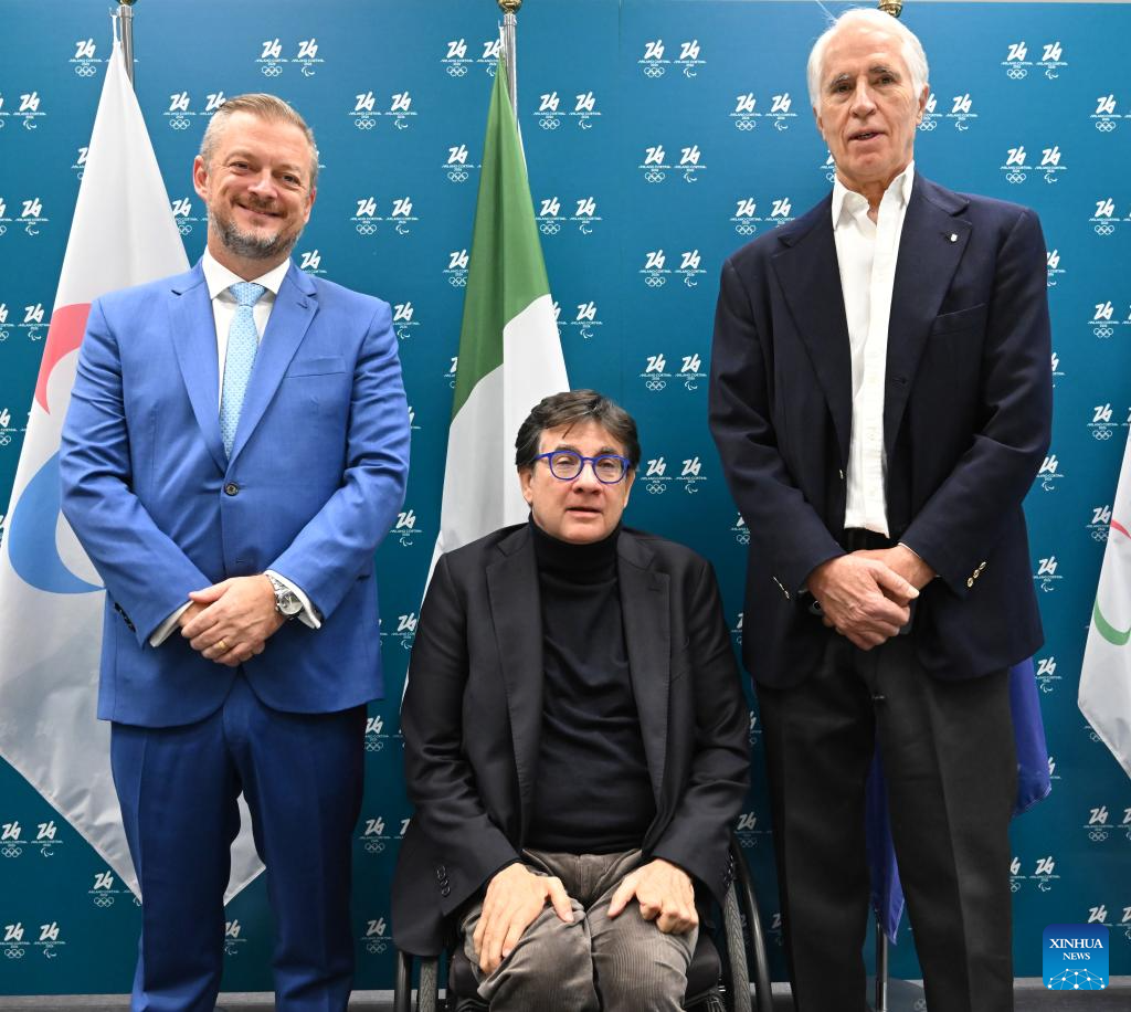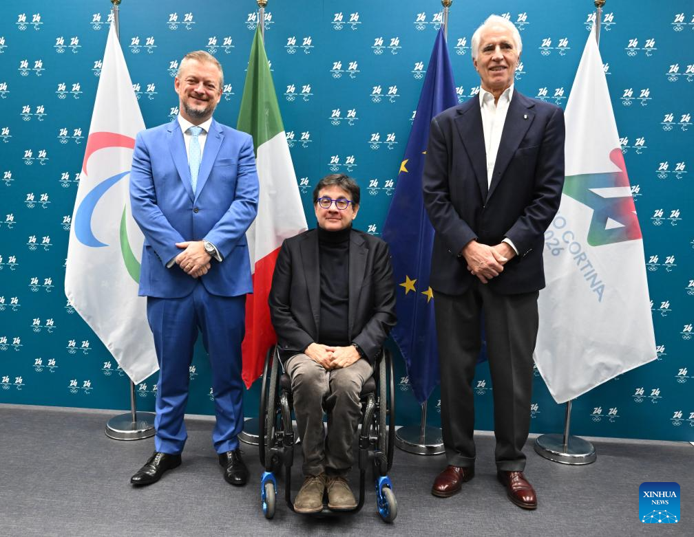 President of the International Paralympic Committee Andrew Parsons (L), President of Italian Paralympic Committee Luca Pancalli (C) and President of Italian National Olympic Committee Giovanni Malago pose during the One Year To Go ceremony for the Milano Cortina 2026 Paralympic Winter Games in Milan, Italy, March 5, 2025. (Xinhua)