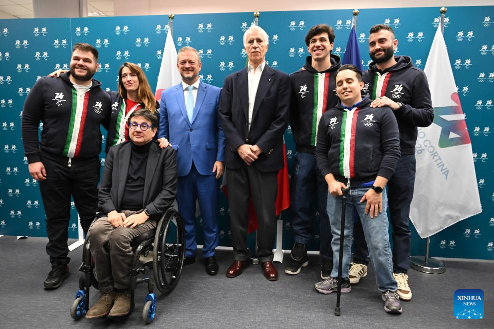 President of the International Paralympic Committee Andrew Parsons (4th L), President of Italian Paralympic Committee Luca Pancalli (3rd L), President of Italian National Olympic Committee Giovanni Malago (4th R) and Italian Paralympic athletes pose during the One Year To Go ceremony for the Milano Cortina 2026 Paralympic Winter Games in Milan, Italy, March 5, 2025. (Xinhua)