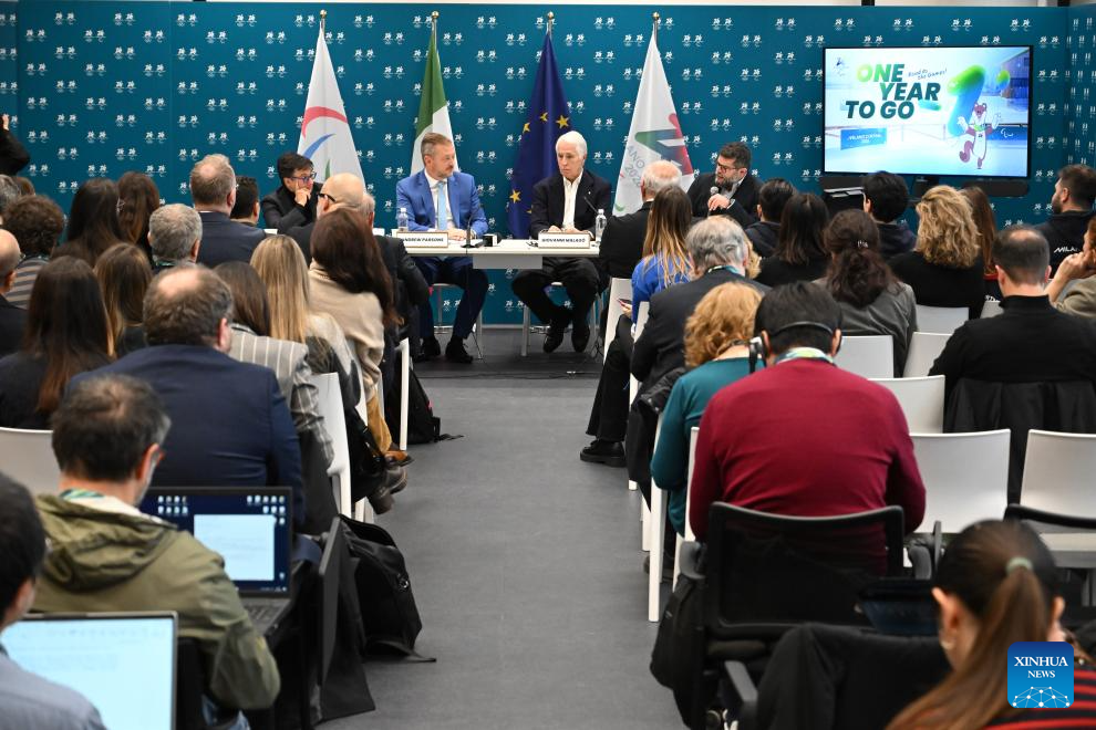 President of Italian National Olympic Committee Giovanni Malago (2nd R) speaks during the One Year To Go ceremony for the Milano Cortina 2026 Paralympic Winter Games in Milan, Italy, March 5, 2025. (Xinhua)