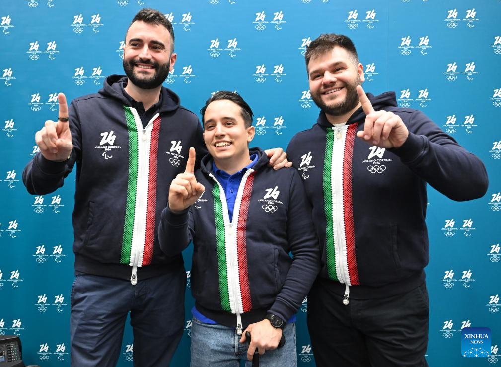 Paralympic ice hockey players Andrea Macri (L), Alessandro Andreoni (C) and Gabriele Lanza of Italy pose during the One Year To Go ceremony for the Milano Cortina 2026 Paralympic Winter Games in Milan, Italy, March 5, 2025. (Xinhua)