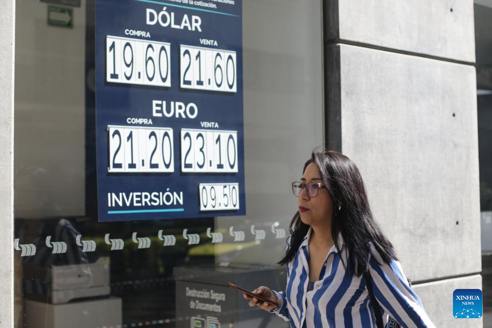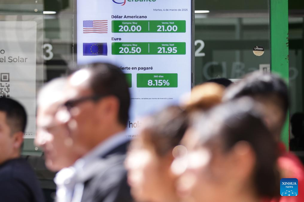 People walk past a sign displaying the dollar exchange rate at a bank branch in Mexico City, Mexico, on March 4, 2025. The 25-percent U.S. tariffs, which took effect at midnight between Monday and Tuesday, have already impacted Mexico's financial markets. The Mexican peso depreciated nearly 1 percent on Tuesday, reaching 20.90 per U.S. dollar in interbank trading. Analysts attribute the decline to concerns over escalating trade tensions, warning that further U.S. tariff hikes could follow. (Photo by Francisco Canedo/Xinhua)