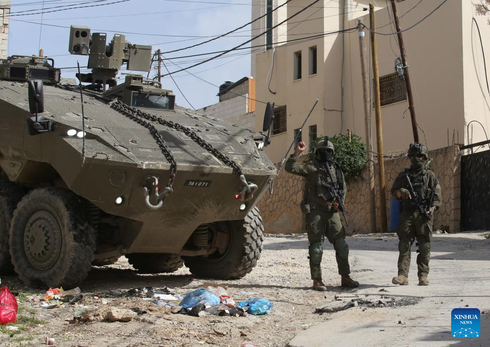 Israeli soldiers are seen during a military operation in the West Bank city of Jenin, on March 4, 2025. The Israeli army on Tuesday killed a senior Qassam Brigades commander and another Palestinian during a large-scale military operation in the eastern neighborhood of the northern West Bank city of Jenin. (Photo by Nidal Eshtayeh/Xinhua)