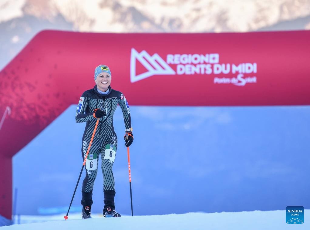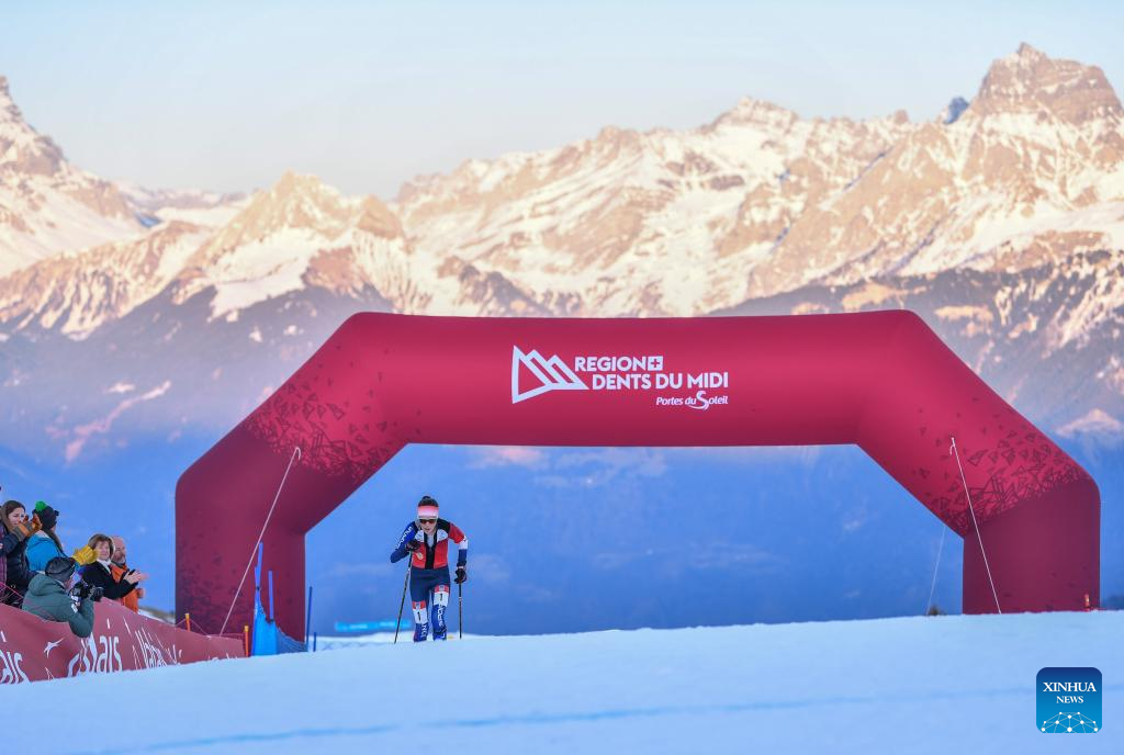 Sarah Dreier of Austria competes during the ski mountaineering women's vertical race final at the 2025 ISMF World Championships in Morgins, Switzerland, on March 4, 2025. (Xinhua/Lian Yi)
