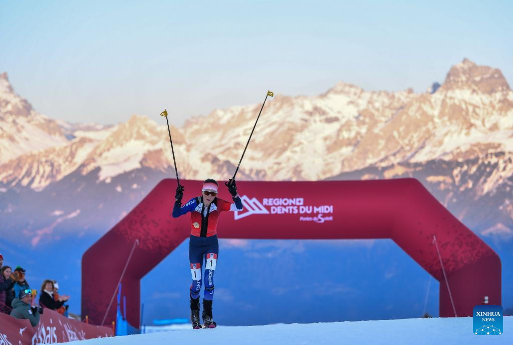 Axelle Gachet Mollaret of France celebrates after the ski mountaineering women's vertical race final at the 2025 ISMF World Championships in Morgins, Switzerland, on March 4, 2025. (Xinhua/Lian Yi)