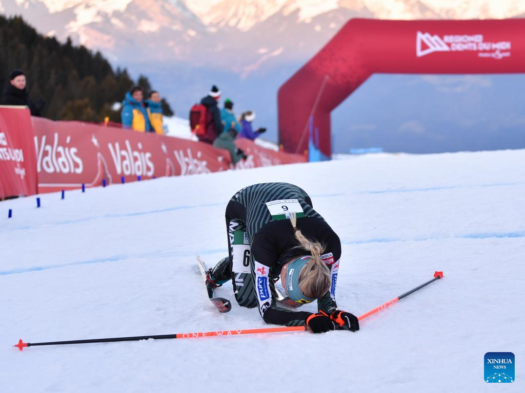 Sarah Dreier of Austria reacts after the ski mountaineering women's vertical race final at the 2025 ISMF World Championships in Morgins, Switzerland, on March 4, 2025. (Xinhua/Lian Yi)