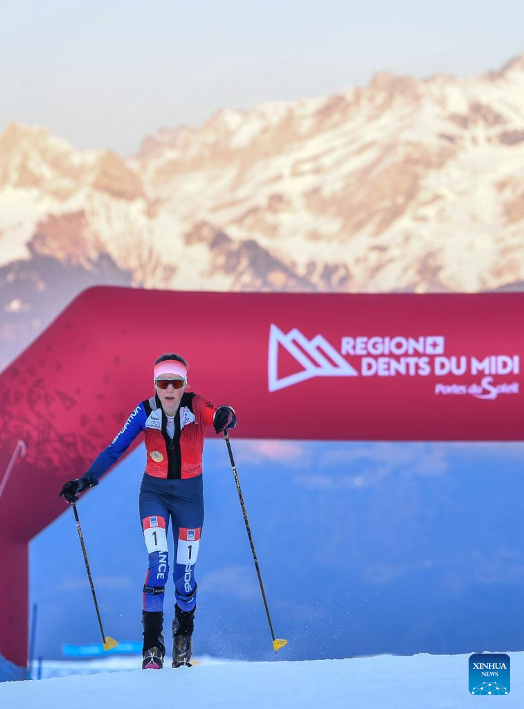 Axelle Gachet Mollaret of France competes during the ski mountaineering women's vertical race final at the 2025 ISMF World Championships in Morgins, Switzerland, on March 4, 2025. (Xinhua/Lian Yi)