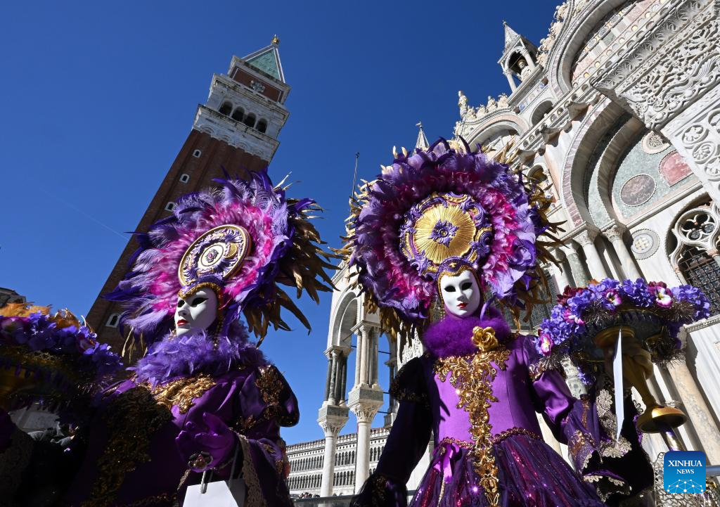 Revelers pose for photos on the closing day of the Venice Carnival in Venice, Italy, March 4, 2025. (Photo by Alberto Lingria/Xinhua)