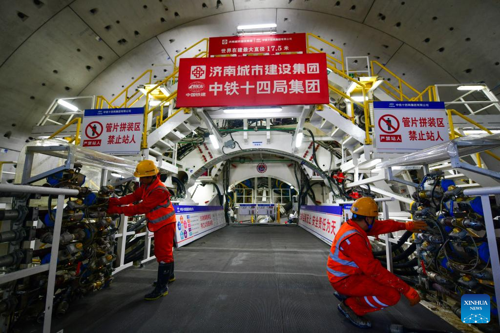 Workers are seen busy at the construction site of a tunnel crossing the Yellow River in Jinan, east China's Shandong Province, March 4, 2025. Construction work of the tunnel section beneath the riverbed of the Yellow River kicked off on Tuesday. About 3,290 meters of this 5,755-meter tunnel are being drilled with a shield-tunneling machine at a diameter of 17.5 meters. (Xinhua/Zhu Zheng)