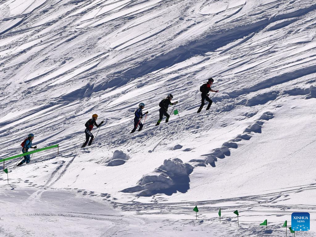 Suolangquzhen (1st R) of China competes during the ski mountaineering mixed relay race at the 2025 ISMF World Championships in Morgins, Switzerland, on March 3, 2025. Chinese pair Zhang Chenghao/Suolangquzhen finished 13th to extend China's lead on the Asian standings. (Xinhua/Lian Yi)
