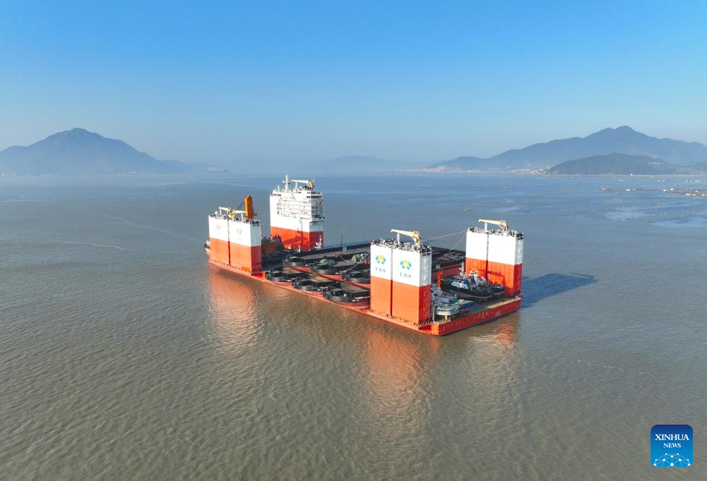 An aerial drone photo taken on Feb. 28, 2025 shows a semi-submersible vessel loaded with 13 commodity ships waiting to set sail at Sanduao sea area, Ningde City, southeast China's Fujian Province. The vessel is the third largest one of its kind in the world. (Xinhua/Lin Shanchuan)