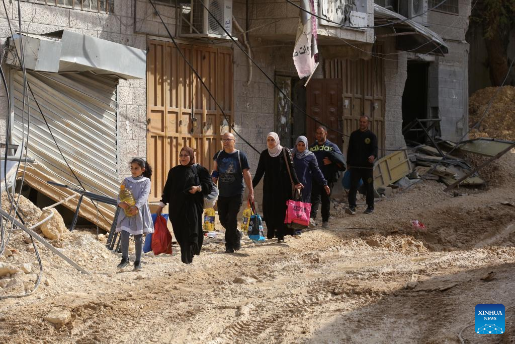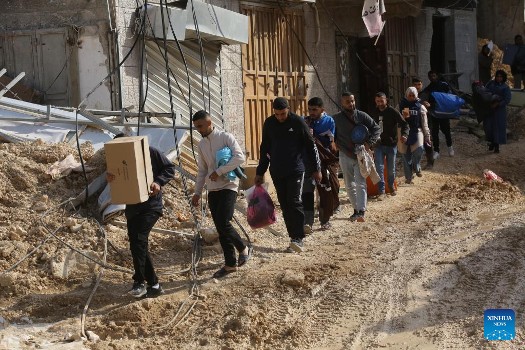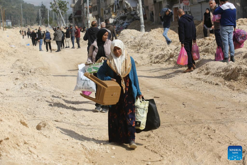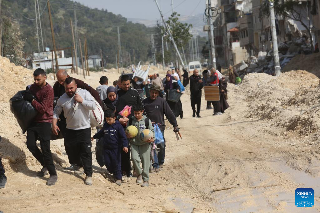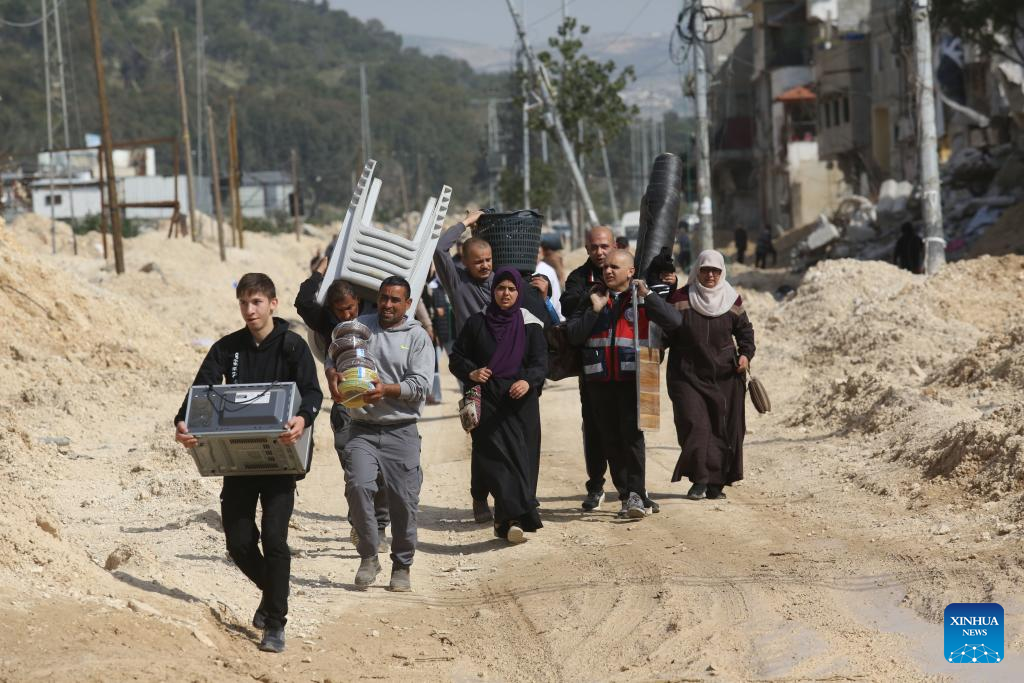 Palestinians carry their belongings after Israeli forces asked them to leave home during an Israeli military operation in the Nour Shams refugee camp east of the West Bank city of Tulkarm, on March 5, 2025. (Photo by Nidal Eshtayeh/Xinhua)