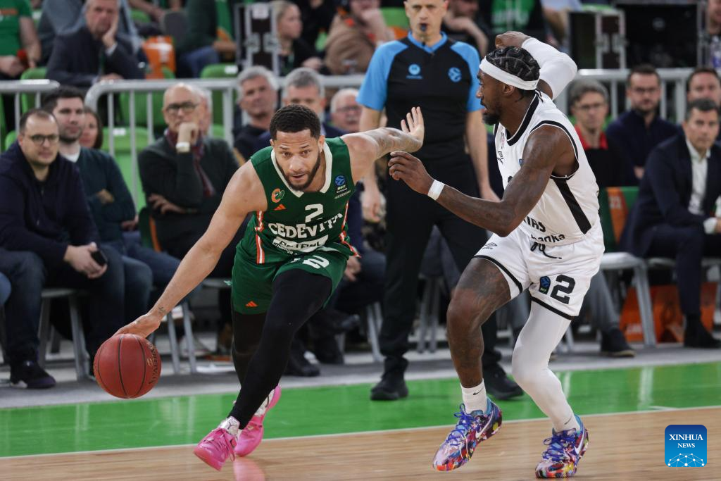 DJ Stewart (L) of Cedevita Olimpija Ljubljana competes during the eighthfinals of the BKT Euro Cup 2024/25 between Cedevita Olimpija Ljubljana and Besiktas Fibabanka Istanbul in Ljubljana, Slovenia, March 5, 2025. (Photo by Zeljko Stevanic/Xinhua)