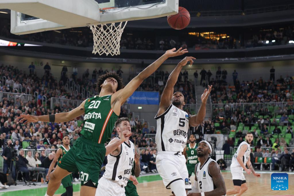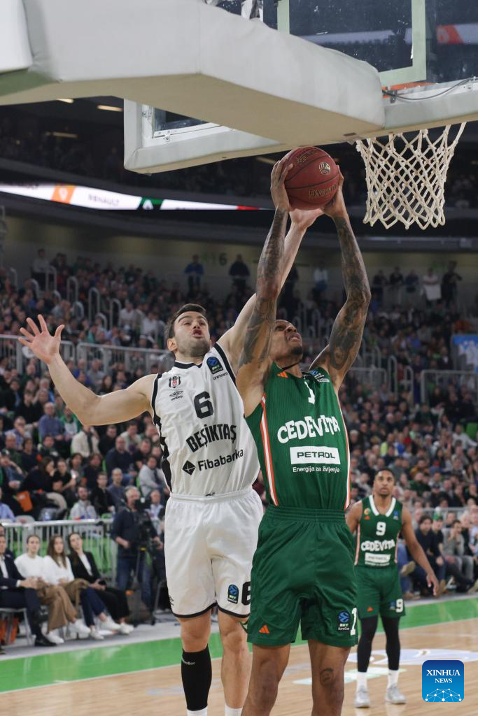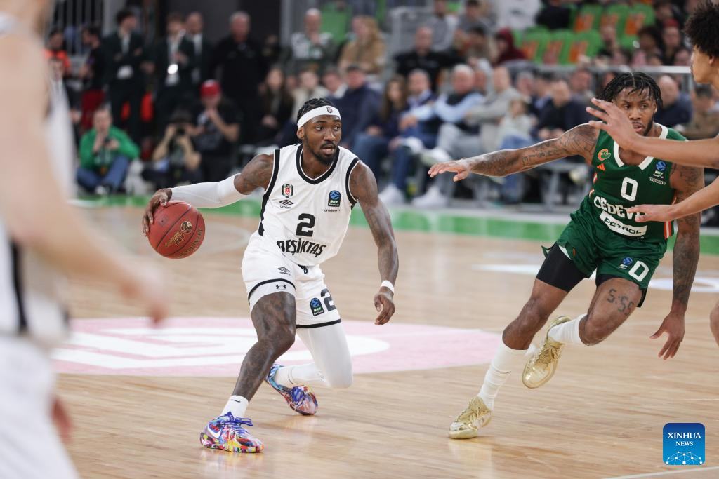 Jonah Mathews (L) of Besiktas Fibabanka Istanbul competes during the eighthfinals of the BKT Euro Cup 2024/25 between Cedevita Olimpija Ljubljana and Besiktas Fibabanka Istanbul in Ljubljana, Slovenia, March 5, 2025. (Photo by Zeljko Stevanic/Xinhua)