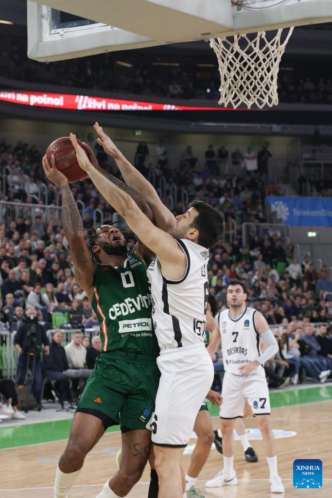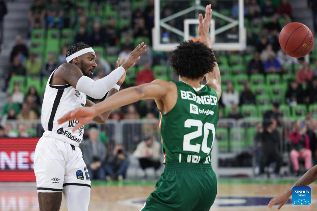 Joan Beringer (L) of Cedevita Olimpija Ljubljana competes during the eighthfinals of the BKT Euro Cup 2024/25 between Cedevita Olimpija Ljubljana and Besiktas Fibabanka Istanbul in Ljubljana, Slovenia, March 5, 2025. (Photo by Zeljko Stevanic/Xinhua)