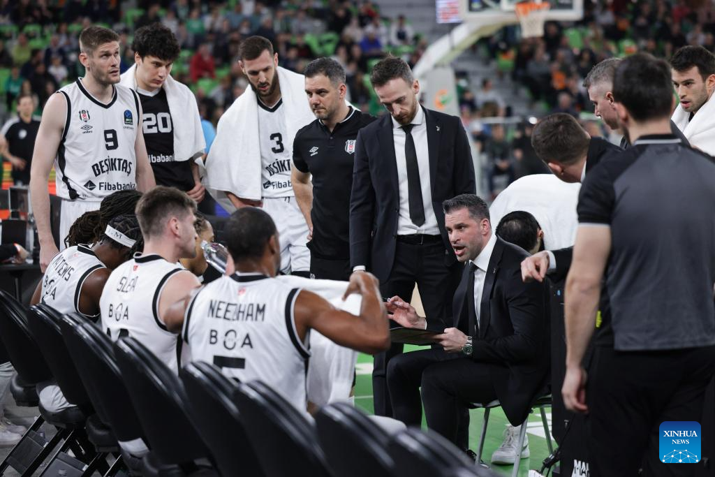 Dusan Alimpijevic (C) , head coach of Besiktas Fibabanka Istanbul, gives instructions to the players during the eighthfinals of the BKT Euro Cup 2024/25 between Cedevita Olimpija Ljubljana and Besiktas Fibabanka Istanbul in Ljubljana, Slovenia, March 5, 2025. (Photo by Zeljko Stevanic/Xinhua)